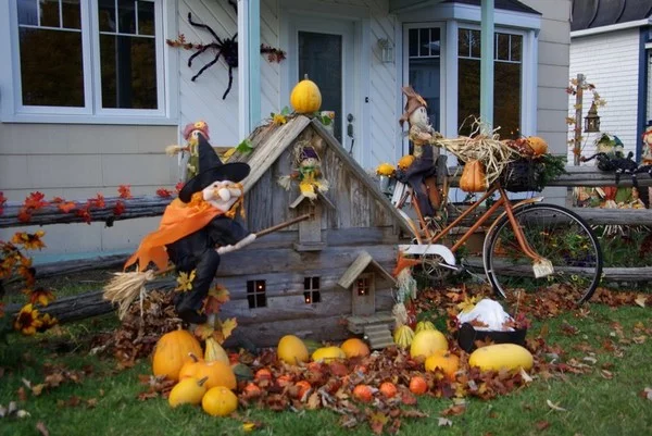 Décoration extérieure d'Halloween devant une maison avec des sorcières sur balai, une petite cabane en bois, des citrouilles, des feuilles d'automne et un vieux vélo décoré.