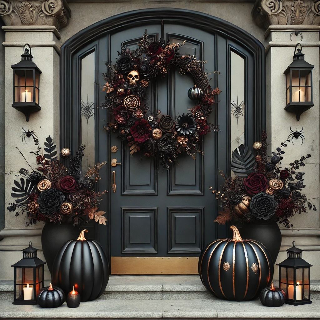 Décoration extérieure d'Halloween chic avec couronne florale noire et bourgogne, citrouilles noires et dorées, lanternes vintage et fleurs automnales devant une porte d'entrée sombre.