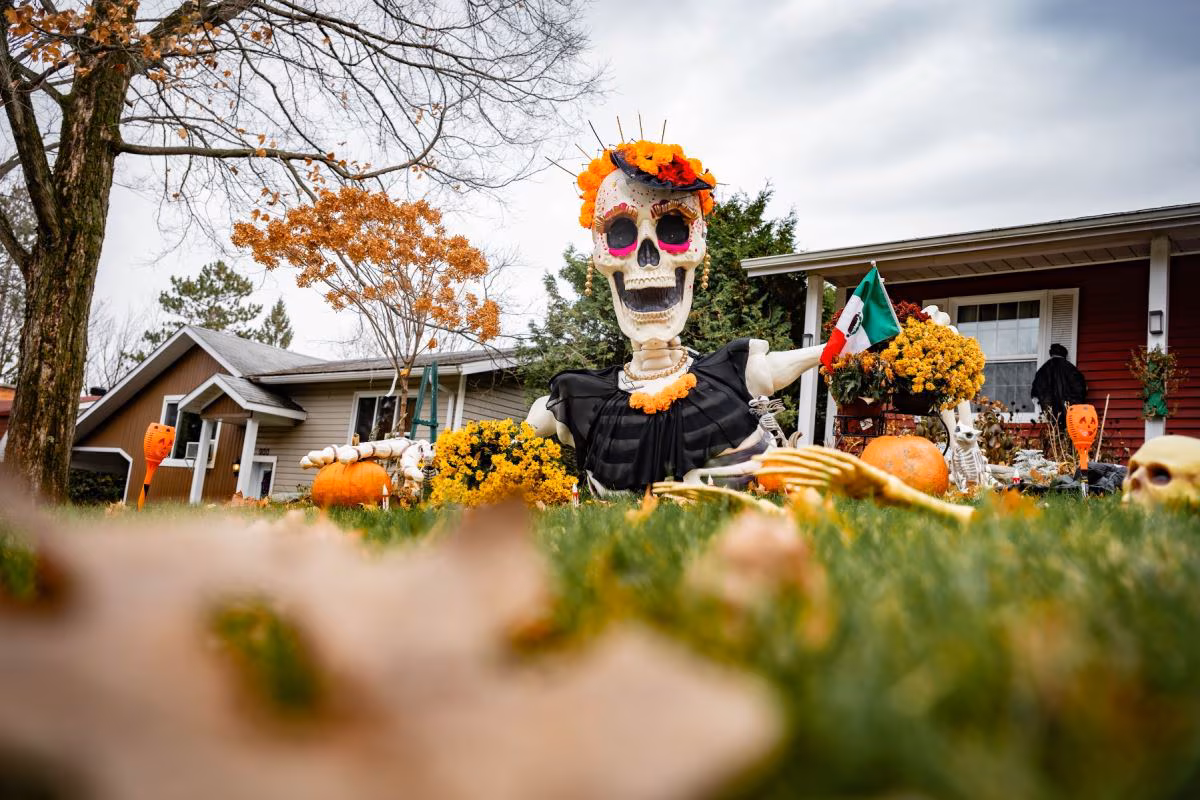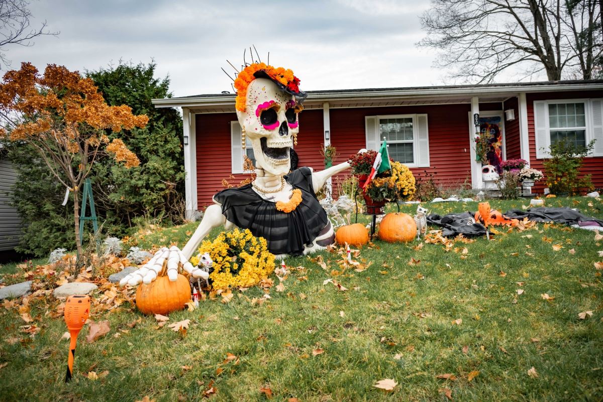 Cour avant décorée pour l'Halloween avec un grand squelette orné de fleurs orange et jaunes, portant une robe noire, entouré de citrouilles et de décorations festives devant une maison rouge.
