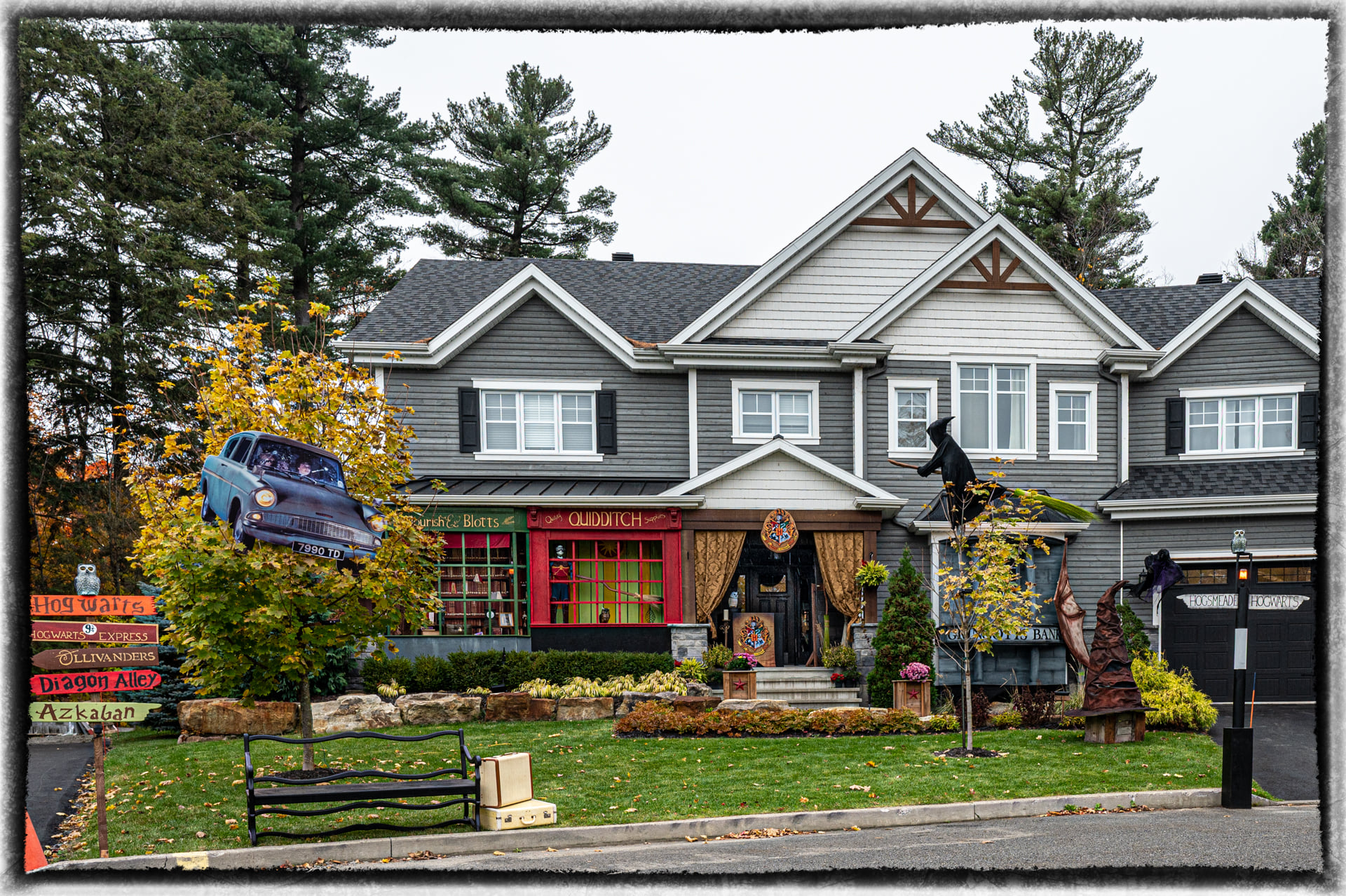 Maison décorée pour l'Halloween sur le thème d'Harry Potter, avec voiture volante, pancartes de Poudlard, sorcières, balais et devanture de boutique magique.