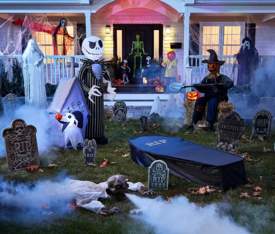 Cour avant décorée pour l'Halloween avec pierres tombales, personnages effrayants, squelette, citrouilles, effets de brouillard et lumières colorées devant une maison illuminée.