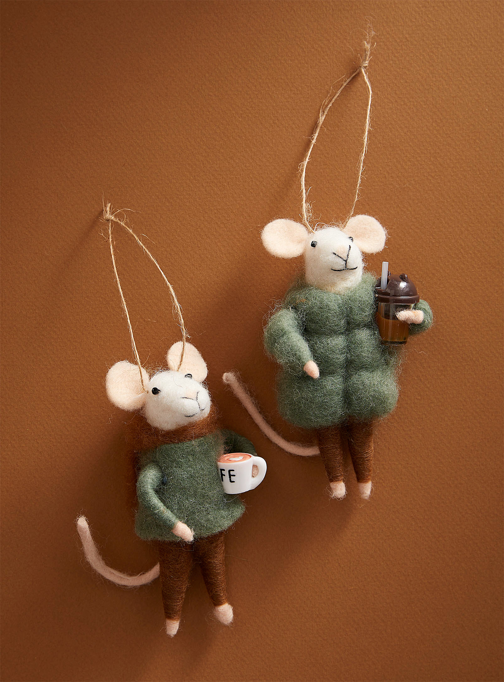 Deux ornements de souris avec café à la main pour décoration de sapin de noel