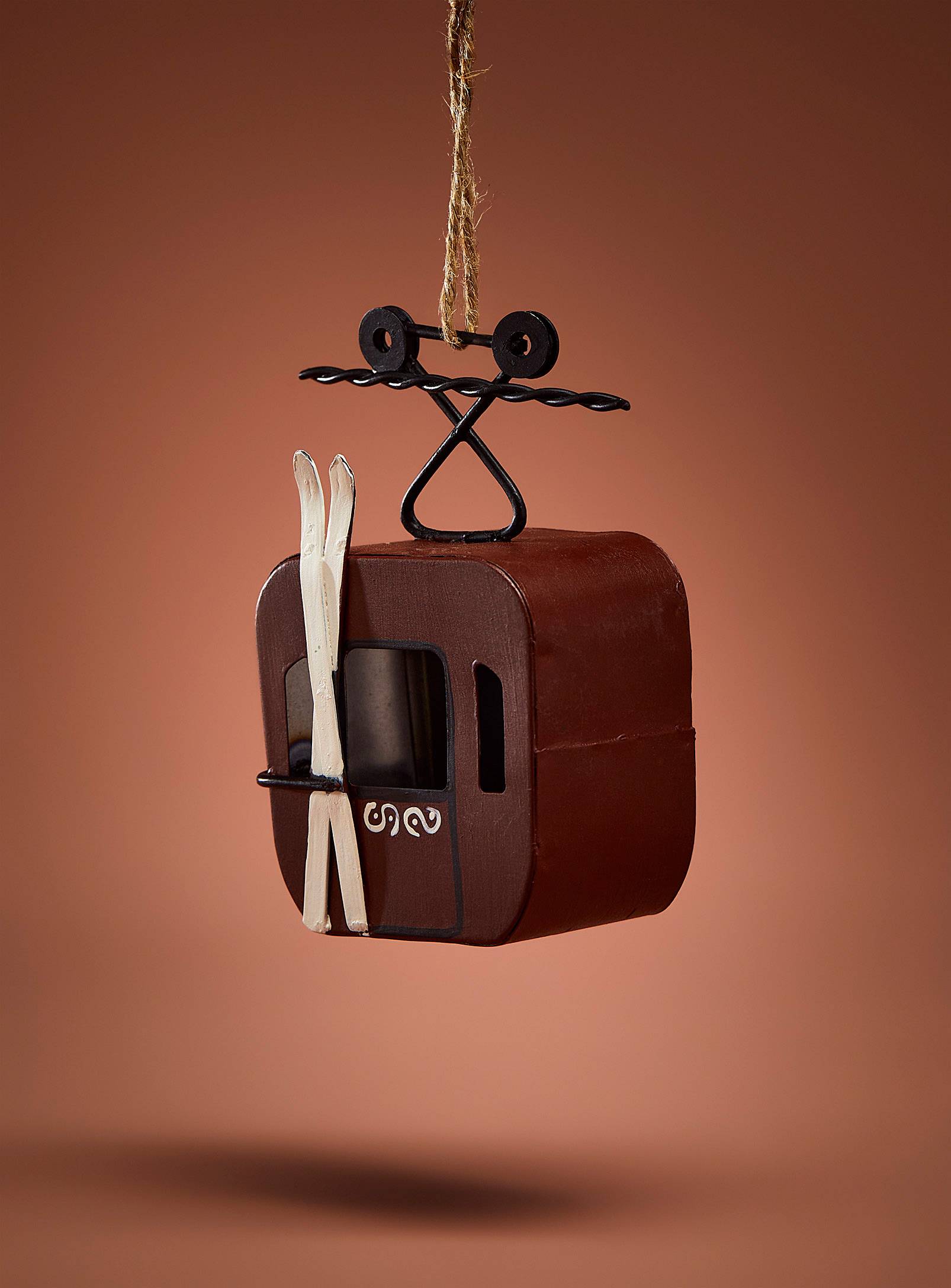 Ornement téléphérique vintage avec Skis pour Sapin de Noel - Confection en métal à l'aspect artisanal