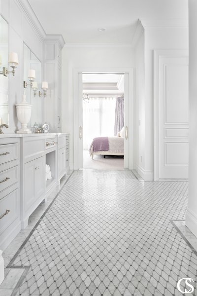 Le sol est recouvert de carreaux de marbre blanc qui renforcent la luminosité et l’élégance de l’espace. Au centre, des portes doubles blanches encadrées de moulures classiques mènent à une autre pièce, ajoutant une touche architecturale à cette salle de bain élégante et fonctionnelle.