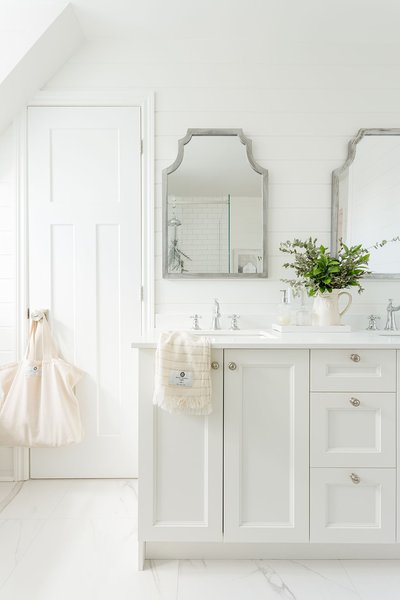 Réalisé par Christopher Scott, cette salle de bain élégante et lumineuse au style classique et intemporel, dominée par des tons de blanc et de gris clair. Le meuble-lavabo double est intégré dans une structure symétrique avec des armoires encastrées et des tiroirs de chaque côté, offrant un espace de rangement généreux. Deux grands miroirs encadrés sont disposés au-dessus des lavabos, reflétant la lumière naturelle et agrandissant visuellement l'espace. De part et d'autre des miroirs, des appliques murales classiques avec abat-jour blancs apportent une lumière douce et chaleureuse.