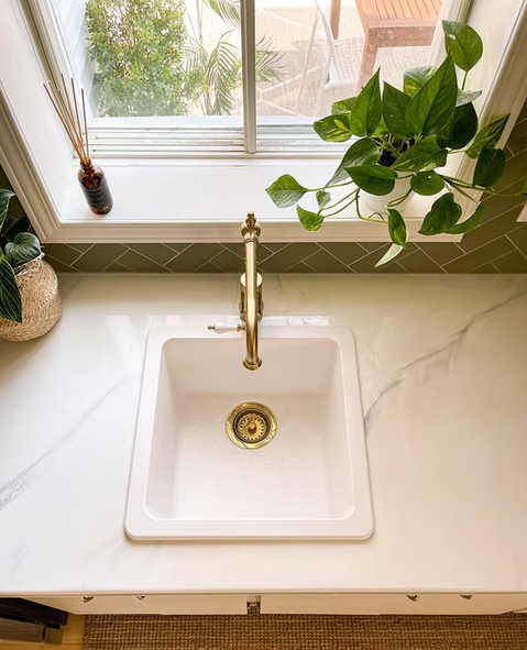 Évier de cuisine blanc encastré dans un comptoir en quartz à effet marbré, muni d'un robinet doré au style vintage, placé devant une fenêtre laissant entrer une lumière naturelle abondante, dosseret en tuiles vert olive en chevron et plantes décoratives apportant une touche de fraîcheur organique de chez Muraluxe.