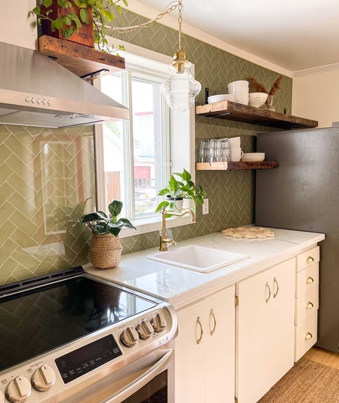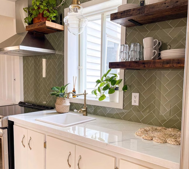 Cuisine lumineuse de style rustique-chic avec dosseret en céramique verte posée en chevrons, comptoir en quartz blanc lustré, robinet doré vintage, étagères en bois massif flottantes garnies de vaisselle, plantes décoratives et évier encastré sous une grande fenêtre apportant une belle lumière naturelle de chez Muraluxe.